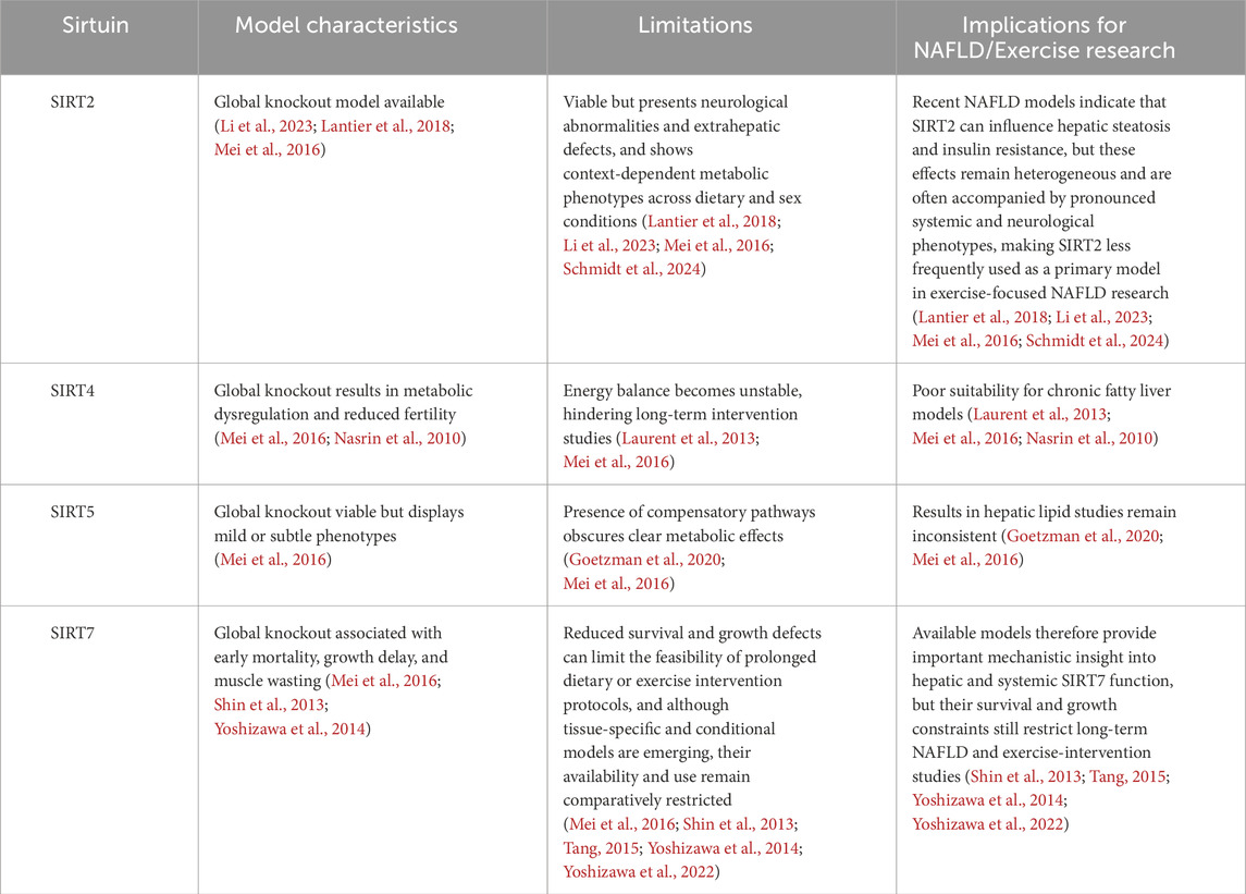 Technical limitations have further reinforced this bias. Among the seven Sirtuin isoforms, viable and well-characterized genetically modified mouse lines exist primarily for SIRT1, SIRT3, and SIRT6. These models remain compatible with whole-body and liver-specific deletion strategies and display clear hepatic metabolic phenotypes under exercise and dietary intervention (Cheng et al., 2016; Kuang et al., 2018; Mostoslavsky et al., 2006). In contrast, SIRT2 and SIRT5 knockout mice show subtle or inconsistent liver phenotypes, while SIRT4 and SIRT7 deletions are associated with reduced viability, growth impairments, or reproductive defects-conditions that hinder long-term exercise-based protocols (Wu et al., 2022; Yoshizawa et al., 2014).