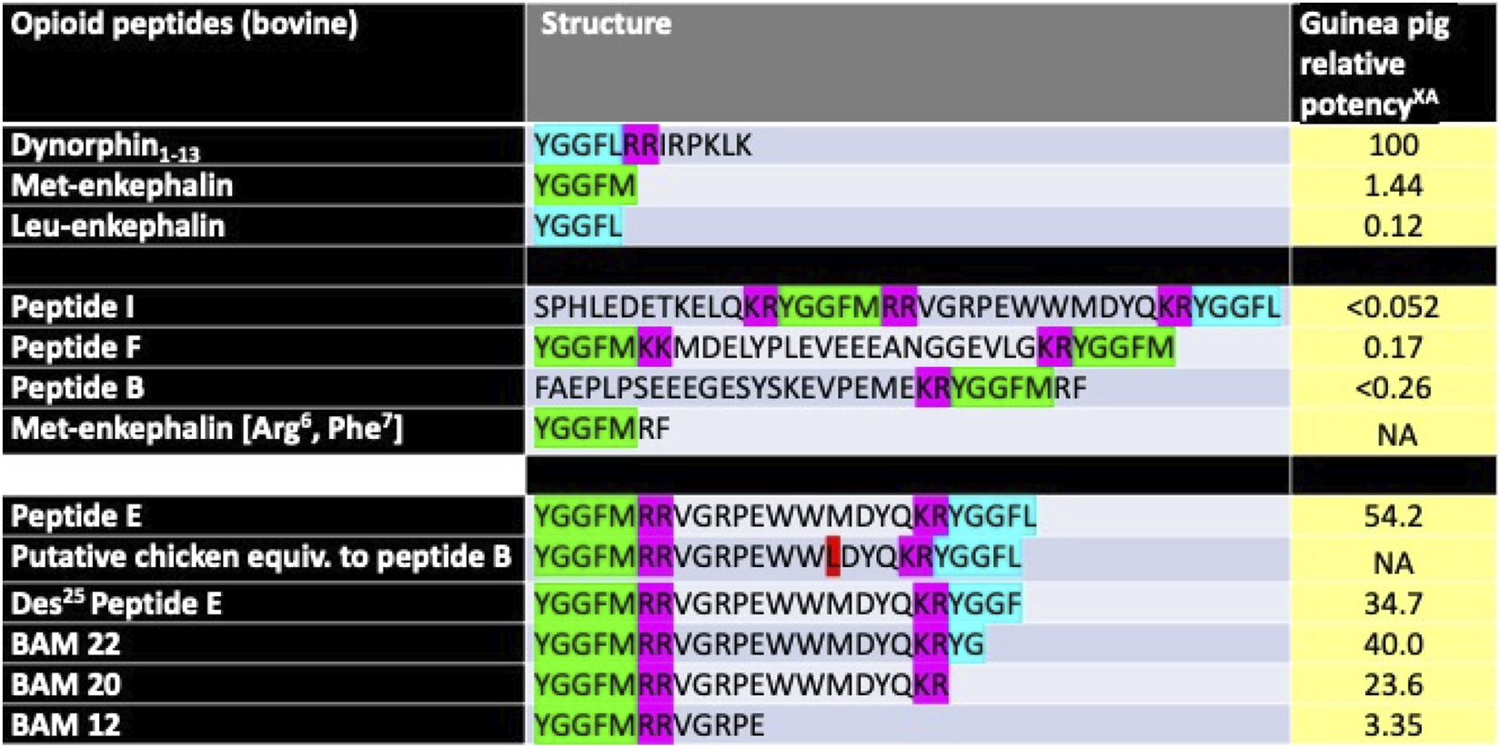 Structure of selected opioid peptides isolated from cattle adrenal glands together with putative chicken homologs and biological activities in a presumed KOR assay. XRelative to dynorphin1-13 as 100. ACalculated from IC50s from Goldstein et al., 1979; Kilpatrick et al., 1981. NA, not available [Key: pink–dibasic amino-acid residues, green–Met-enkephalin residues, blue–Leu-enkephalin residues, red–difference between chicken and bovine sequences).