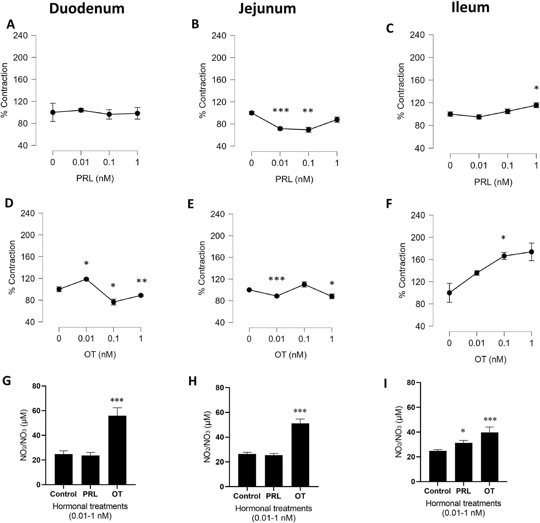PRL and OT contractile effects in precontracted isolated rings of rat duodenum, jejunum, and ileum. The graphs represent the % of contraction in response to 0.01–1.0 nM of PRL (A–C) or OT (D–F) compared with the control (0 nM), which is represented by the value of 100% of contraction with KCl. Results are expressed as the mean of the percentages (%) ± SEM. Stabilized responses were measured at 29 min, 49 min, 69 min, and 89 min in experiments using cumulative hormone additions. Following hormone addition, tissues were incubated for 20 min before sample collection. For each time point, nine values were sampled from the stable plateau of the trace, deliberately excluding the transient peaks that occurred immediately after hormone addition. Data were analyzed using repeated-measures ANOVA, with hormone concentration as the within-subject factor and, when applicable, hormone type (PRL vs. OT) as a between-subject factor. NO production expressed as the accumulation of NO2/NO3 in the physiological solution after treatments (G–I). Values are expressed in µM as mean ± SEM. *P = 0.05, **P = <0.01, ***P < 0.001 vs. the control. The experimental unit was the animal, and n represents the number of animals. n = 5 biological replicates.