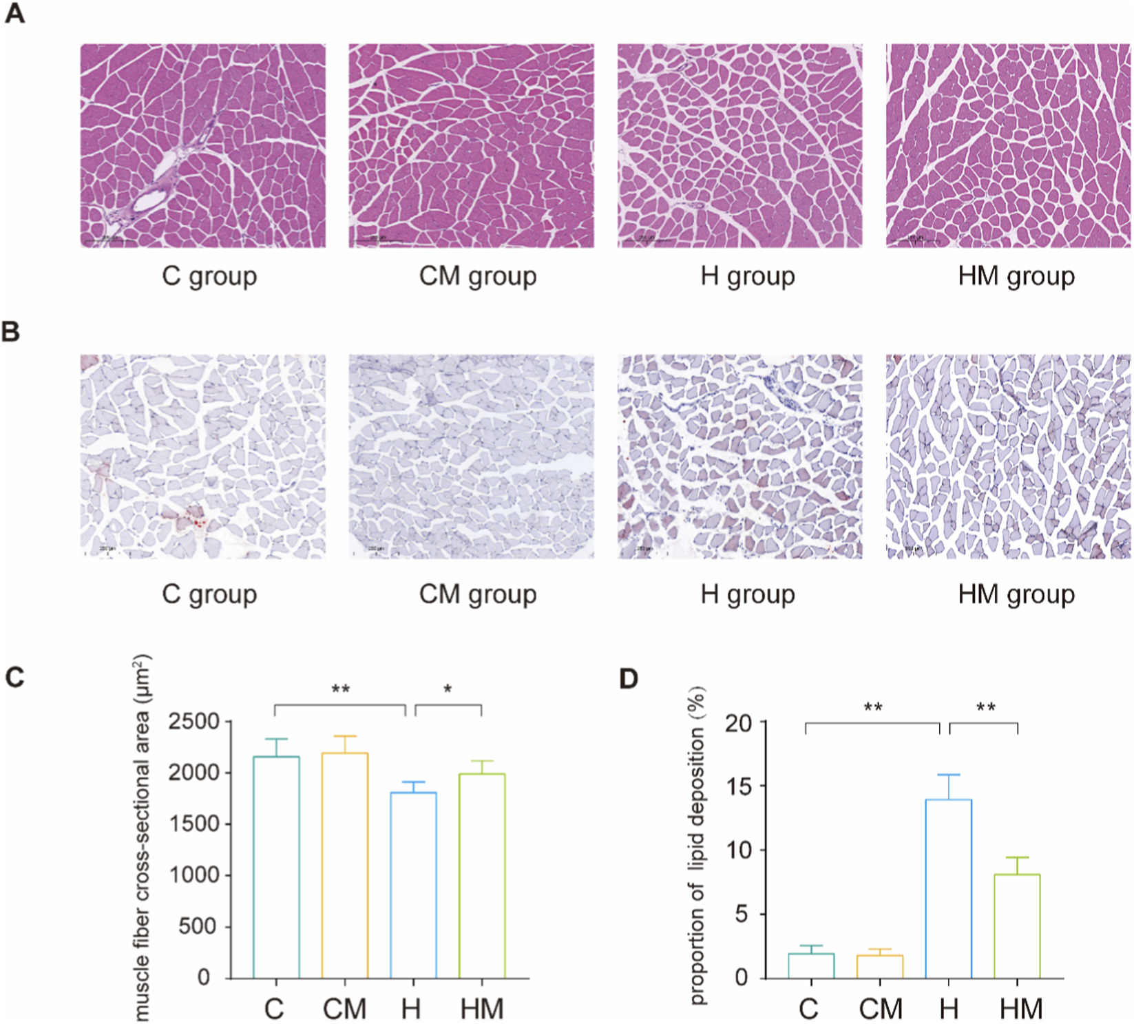 At the experimental endpoint, body weight and serum glucose levels were significantly elevated in the H group compared with the C group, but were markedly reduced in the HM group relative to the H group (Figures 1A,B). Consistently, the gastrocnemius muscle index and normalized forelimb grip strength were significantly decreased in the H group and were significantly restored in the HM group (Figures 1C,D). Histological analysis further revealed reduced muscle fiber cross-sectional area, disrupted fiber organization, and increased lipid accumulation in the gastrocnemius muscle in the H group; in contrast, these pathological alterations were significantly attenuated in the HM group (Figures 2A–D).
