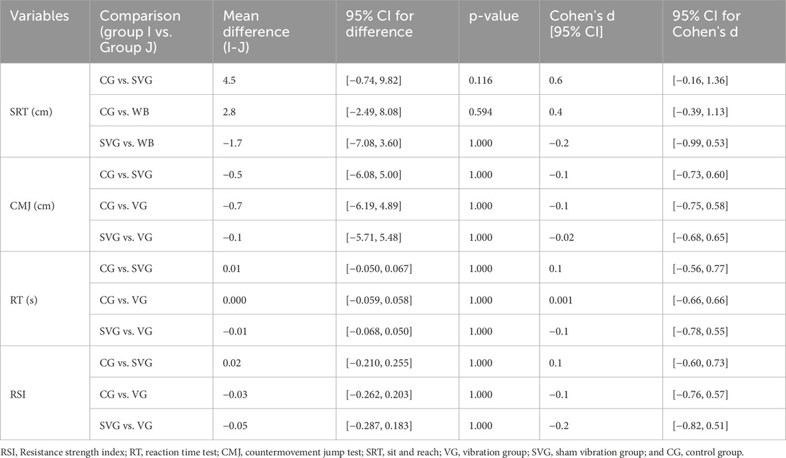 The activation of the primary endings of the muscle spindle following WBV is demonstrated to stimulate the stretch reflex, promoting contraction of agonist muscles and inhibition of antagonist muscles through the activation of the Ia inhibitory interneurons (Barrera-Curiel et al., 2019). Consequently, better intramuscular coordination lowers the braking force around the hip and back, key body segments in SRT performance. This would justify the improvement in the SRT score. In our study, the significant improvement in SRT performance over time between the two measurements occurred in all three groups (Table 2). In line with our results, Cochrane et al. showed improved flexibility measures following the WBV protocol involving the arm and leg. Unlike our study, this increase was significant in the VG but not in the control group, and the group performed other exercise protocols (Cochrane et al., 2010). The SRT administered by Cochrane et al. had been run twice each detection (4 times in total), in contrast to our three times per detection (six times in total). In a study conducted earlier by our research group, performing SRT six times significantly improved the SRT score in different conditions, demonstrating a strong learning effect and improved performance in flexibility tests due to the warm-up factor and, consequently, the threshold of the firing rate of the muscle spindle after a higher number of SRT repetitions (Petrigna et al., 2025b). This could justify the SRT improvement we found in all groups.